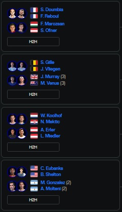 The third quarter looks set up for the survivor of the opener against Murray-Venus and Gille-Vliegen to be the team to beat. While Doumbia-Reboul showed some chops on this surface late last season with a title in Chengdu and a semifinal run in Shanghai, they’re still better on clay. Don’t count them into the quarters either as Marozsan-Ofner competed well in their first match together last week in Hong Kong. They lost 11-8 to Erler-Miedler in a super tie break in their lone match. I think that one could at least go to the STB before being decided. As for Murray-Venus and Gille-Vliegen, pick your poison. Gille-Vliegen get the nod for already having played this year and having some good form carrying over. Murray-Venus were quick starters in their first team up last year in Adelaide, but went just 1-2 combined in Auckland and Melbourne after that run. The safest guess might be that we see a super tie break between the two, but calling a winner is difficult. If I had to, I’m going with Murray-Venus because the Belgians on hard courts have not often followed up big results with matching ones.