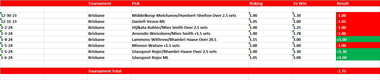 This second quarter looks very entertaining. You start right away with the rematch between Lammons-Withrow and Bhambri-Haase that figures to be a 50-50 call. Then you toss in Hong Kong champs Arevalo-Pavic along up against Cash-Galloway. Cash-Galloway also played Hong Kong to start 2024 with a solid super tie break win over Doumbia-Reboul to start before losing to Gille-Vliegen 7-6, 7-5 in the semifinals. Arevalo-Pavic displayed the kind of chemistry you want in a new pairing as they went 4-0 last week. Only one match went to a super tie break, so they were rock solid overall. This seems like a big week for them as they can prove themselves to be a top flight team right out of the gate with another strong week. This draw is definitely tougher for them I think than what they saw early last week. I’d love to get an Arevalo-Pavic vs Lammons-Withrow quarterfinal. Lammons-Withrow remain a good love for the OVERS totals lovers as they played four sets and four tie breaks last week in Brisbane. In their run last year in Auckland, five of their eight regulation sets went to tie breaks.