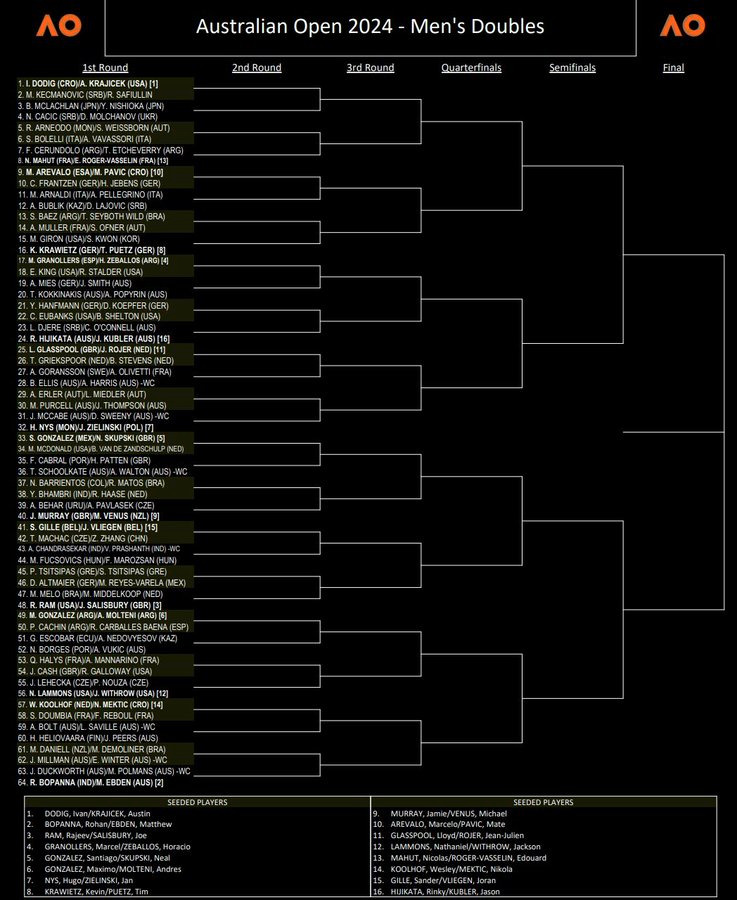 The top half here is led by (1)Dodig-Krajicek with French vets (13)Mahut-ERV as the opposite seed. Dodig-Krajicek as mentioned earlier will be facing an interesting singles pairing in Kecmanovic-Safiullin to start. I don’t know the status of the top seeds after their withdrawal last week in Adelaide, but it’s eerily similar to 2023 when they pulled out of the Adelaide final and then got beat in round one at the Aussie Open debut. The top seeds have also had an odd go at Grand Slams in their time together since 2022. The French Open has seen them win their lone Slam title together in 2023 and another final in 2022, but in the other five Slams they’ve played, they’ve failed to get past round two. If healthy, you’d surely expect them to survive, but that’s the question and I think round one could be a tougher battle as a result. Watch McLachlan-Nishioka as a potential round two opponent. They’ve played reasonably well together with four Slam matches in 2023. Their three losses last year were to Arevalo-Rojer (2x) and Ram-Salisbury. There’s no shame in that, but it also means if they meet Dodig-Krajicek that’s probably the end of the road.
