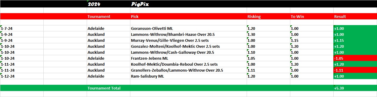 What? Yes. While this team grew in confidence in 2023 obviously by making the Tour Finals, don’t forget that they crashed and burned at both the Australian Open and French Open in round one. They get one of the Aussie wild cards in Duckworth-Polmans to start. Bopanna-Ebden looked solid in Adelaide, but could there be any hangover after another tough finals defeat? They did a nice job in 2023 of bouncing back from disappointment, but they also did not have to do it quickly as they will in this spot. I think they likely win, but it’s one that could be interesting if the Aussies get out to an early lead.