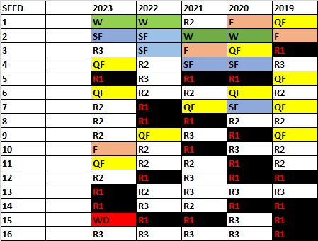 *Unlike the men, the women have routinely seen the power duos in the upper echelon involved in the business end of the Australian Open. As you see in the grid below, 12 of the last 20 semifinalists have been top four seeds. Seven of the last ten finalists have been either a one or two seed. Interestingly too, a top five seed has been beaten in round one in four of the last five runs.