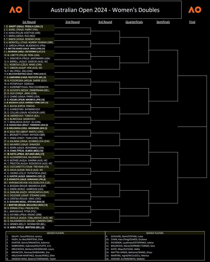 (2)Hsieh-Mertens reunite to highlight this final quarter. The two seeds had not played together since 2021 before their 2024 opening loss in Brisbane. They did not look great, but obviously know their way around Slams after having won the Wimbledon titles in 2021. Their starter against Minnen-Wickmayer might be a bit of a battle with the Belgians having good experience together, but they’re void of any truly meaningful wins in their work together. With Hsieh’s singles career finished, the six-time Slam doubles champ will certainly be hyper focused now on doubles. I think knowing the Australian Open was her last singles competition and looking forward to qualifying may have taken slightly from her focus when they started in doubles, so I’m expecting them to improve and grab an early win. They’re certainly set up for success in this half where unseeded Italians Errani-Paolini may wind up being their biggest threat. The 15 seeds, Gamarra-Niculescu, are veterans of the doubles courts, but it’s their first time playing together. Getting a duo like Errani-Paolin first up is rough.