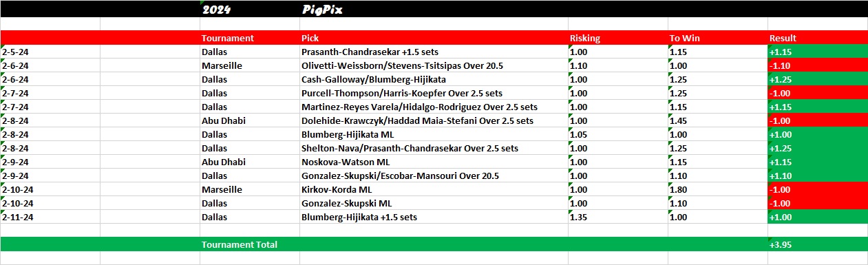 *Overall, underdogs feasted in 2023 with eight of the 15 matches going to the dogs. Five of those hits came in round one. The largest was 4.33 (+333) when Bublik-Wawrinka took out (2)Mektic-Pavic. 2022 saw six dog wins with a high of 4.05 (+305) coming in round one again via Mektic-Pavic losing again. 2021 was the last time that underdogs didn’t find much success with only two of 15 matches falling to the dogs. The prices may not reach even the 3.00 mark for the biggest score early, but the depth of this small field should give the dogs plenty of opportunity to bark with round one again looking like a round to focus on.