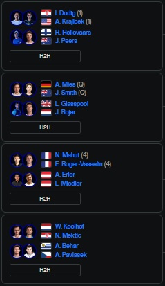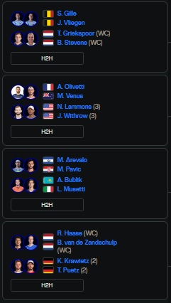 The third quarter might have lesser known partnerships outside of (3)Lammons-Withrow, but they all look dangerous. Lammons-Withrow have that starter against Olivetti-Venus to be concerned with in round one. The Americans were very good indoors in 2023 at 11-4 with three finals and one title (Astana). They could use a good run this week to get them feeling like they are truly on track this season. If they escape round one, they have that shot to go farther. The match on the other side features regulars Gille-Vliegen and another dangerous Dutch duo in Griekspoor-Stevens. Gille-Vliegen play here for the fourth year in a row with last year’s semifinal run from qualifying as their best showing. They come in hot off a Davis Cup victory over Dodig-Pavic. I’d expect a typical tight doubles match in this one. The Belgians have had one big run indoors each of the last four years, so you cannot count them out. Lammons-Withrow would LOVE to see the Belgians get through as they’ve beaten them five out of five meetings.