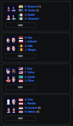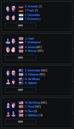 The two top 20 American singles stars team up again with a half dozen doubles matches together. The last came at the 2023 Laver Cup where they beat Arthur Fils and Andrey Rublev. While they have only a 3-3 record, one thing that does stick out is that they’ve been involved in super tie break finishes in ALL six of their matches together. Their best match might have been a super tie break LOSS to Glasspool-Heliovaara in Cincinnati back in 2022. They may not win, but they might put up a good fight if Paul’s ankle isn’t a hindrance from his last match at Indian Wells.