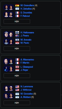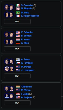 The bottom half starts with that tremendous (6)Gonzalez-Molteni vs Lammons-Withrow starter in round one. The winner gets Glasspool-Rojer or a one-off pairing of Adrian Mannarino and Fabrice Martin. The French pair have teamed up before with 19 total matches (9-10) in their careers. They should not be overlooked as they made a final in Astana back in 2022 and have normally shown a competitive streak together. The negative is this is their first time together since the Paris Masters in 2022. Glasspool-Rojer come in with three straight quarterfinals, including a nice on last week in Indian Wells that saw them knock out Ram-Salisbury in round two. They scored their first back-to-back wins in that tournament since the Australian Open. I really believe any of these four teams could grab the QF spot in this section. Gonzalez-Molteni made the quarters in Miami a year ago, but all three of their matches required super tie breaks. Three of their last four matches have gone that way as well, but all three have resulted in losses.