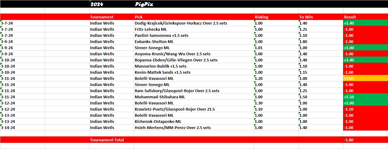 *Underdogs were not a big part of the story in 2023 with just seven hits out of those 31 completed matches. The largest dog was substantial though at 4.45 (+345) when Tommy Paul and Ben Shelton knocked out (2)Ram-Salisbury in round two. The next biggest score was 2.67 (+167) in the quarters when Lammons-Withrow topped (5)Glasspool-Heliovaara. The dog hits were fairly consistent from 2022 when eight underdogs scored wins in Miami. 2021 was a bigger year for the underdogs with 13 dog scores.
