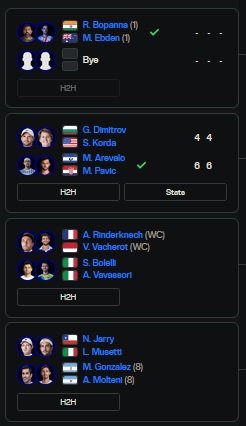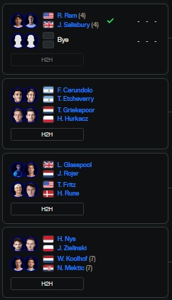 The top two teams in the race could feasibly make it through to a semifinal clash with Bopanna-Ebden and Koolhof-Mektic, but there is A LOT of clutter and very noisy clutter at that in between anything like that happening. I probably trust Bopanna-Ebden more, even with another battle against Bolelli-Vavassory possible. Ram-Salisbury might be the sneaky seeded pick to sneak into the semis, but I can’t discount the plethora of unseeded danger duos in that quarter. The Glasspool-Rojer/Fritz-Rune survivor sticks out as one to watch and I still think Griekspoor-Hurkacz are a big time threat.