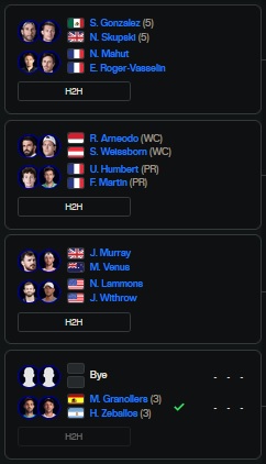Quarter three has an insane amount of talent in it. You’ve got the seeds in Granollers-Zeballos and Gonzalez-Skupski, and then four of the other five pairs and regular teams with plenty of juice to come through this section. Let’s start with the Granollers-Zeballos half, where the three seeds face a tricky opener. They wait for the winner between Murray-Venus and Lammons-Withrow. Lammons-Withrow stumbled in their first work on clay in Houston, losing to Harris-Hiikata in straight sets. It’s definitely not their preferred surface as they sit under .500 on clay in their careers. Murray-Venus meanwhile have shown winnability on dirt with an 18-7 mark on clay. They did crash out in their opener in MC last year and have not played since withdrawing from Indian Wells in round two due to an abdominal injury to Murray. The long layoff and new surface will be tough, but Murray-Venus have found the win column in four of six career meetings between these two teams. That includes each of the last three dating back to Madrid in 2023, but they did need super tie breaks to settle two of those and four of the six overall have had STB endings. I think that could be in the cards again given Murray-Venus’ layoff and lack of match play.