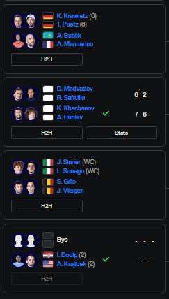 The final quarter houses the defending champs, Dodig-Krajicek. Their round two opener is one to look at as mentioned earlier with either Gille-Vliegen or Sinner-Sonego. Again, my contention here is the Italian combo is a much more threatening test. Dodig-Krajicek have beaten Gille-Vliegen pretty routinely each time they’ve met, so I’m not thinking the Belgians would turn it around in this spot. The other half of this quarter already has Khachanov-Rublev in round two, waiting for either the other seed (6)Krawietz-Puetz or Bublik-Mannarino. Those two met at Indian Wells with the Germans escaping a 7-6, 7-6 battle. Krawietz-Puetz continue to be an unsung duo for me at 12-6 in 2024 with semifinals both in Indian Wells and Miami. They have lost their opener just once in six tournaments. The Germans also made the semifinals here a year ago, so I’m looking at them to be the team that may give Dodig-Krajicek the most trouble. They took them to a 10-7 super tie break loss in Miami in their last action, the second time in three career meetings that they pushed Dodig-Krajicek to a decider before losing.