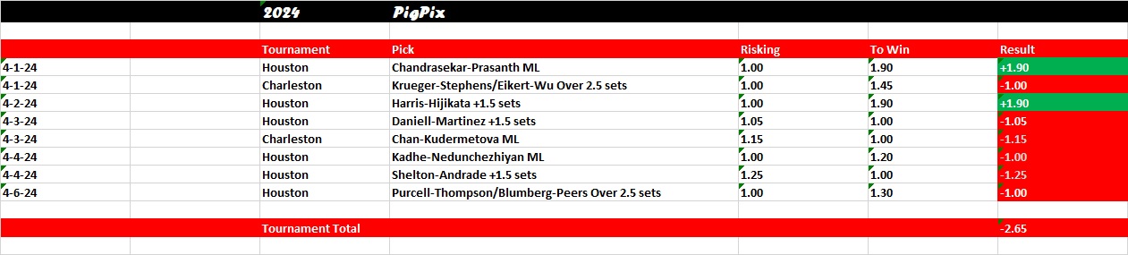 *The largest dog hit came in the round of 16 last year at 3.26 (+226) when Arneodo-Weissborn knocked off (2)Ram-Salisbury. The biggest in 2022 was also in that round when Melo-Zverev upended (4)Herbert-Mahut at 2.72 (+172). The monster dog hit of the last three years came in round one back in 2021 when the Tsitsipas brothers took down (8)Krawietz-Tecau as 5.26 (+426) dogs in round one. Again, the first two rounds have been a more consistent source if you’re a dog hunter, so do your thing in those rounds.