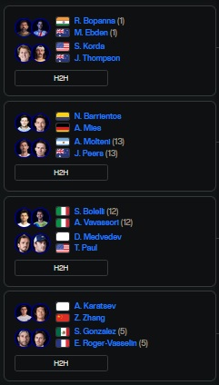 Quarter one has the top seeds and 2023 runners-up, Bopanna-Ebden. They’ve dropped their opener in two of their last three with the Miami titles sandwiched in between. I feel like the conditions in Madrid play well for them, but it could be a battle in R1 against Korda-Thompson. I do like Bopanna-Ebden to survive, but a super tie break would not be surprising. If they survive, they should be set up well against one of the first time teams of Molteni-Peers or Barrientos-Mies. In the bottom half, (5)Gonzalez-ERV team up for the second straight tournaments after reprising their 2023 partnership in Barcelona. They made the semifinals here last year, so the conditions suit them. It seems likely they could battle Bolelli-Vavassori for a potential rematch against Bopanna-Ebden, who took down Gonzalez-ERV in the semis (10-4 STB). The 12th seeded Italians have stumbled of late with opening losses in two of three, but this draw works a bit better (I think) to avoid that fate. I’d love to see Bopanna-Ebden vs Bolelli-Vavassori, part three. Bopanna-Ebden have won both, but the Italians have made them work hard.