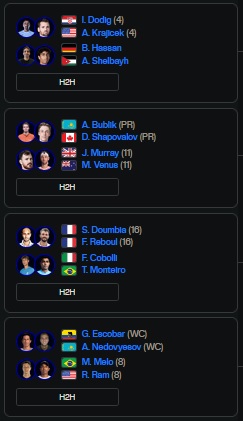 The second quarter is led by (4)Dodig-Krajicek. Dodig-Krajicek lost their opener in Madrid in 2023 and come in off their only one and done in Monte-Carlo. That shouldn’t be a problem as they’re matched against two players in Hassan-Shlbayh who are ranked outside the top 300 in the rankings. They should be waiting for the Murray-Venus/Bublik-Shapovalov survivor in round two. The bottom half may come down to (16)Doumbia-Reboul or Escobar-Nedovyesov. Doumbia-Reboul are red hot with back to back finals in Estoril and Bucharest (win). It was Escobar-Nedovyesov who beat them in the Estoril final. Doumbia-Reboul beat them on hard courts in Acapulco earlier in the season. (8)Melo-Ram are ones to watch if they can escape round one, but I don’t know if that happens.