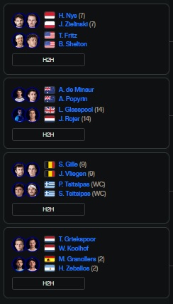 The Belgians draw the Tsitsipas brothers to open. The Tsitsi-bros already own a win over Gille-Vliegen back in 2021 indoors in Rotterdam. That is the same year Gille-Vliegen made the semifinals in Madrid in their lone previous trip. The Tsitsi-bros have lost three round one matches in Madrid dating back to 2021, but took their opponents to super tie breaks twice and lost 7-6, 7-5 to Arevalo-Rojer in 2023. This one should be tight with the Greeks having a real shot to score the win.