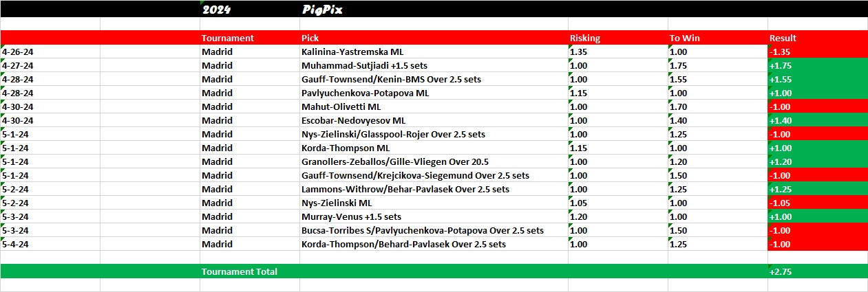 *Unseeded pairs ran roughshod over the field in 2023, making up three quarters of the semifinal field. That marked the fourth straight year in Rome that multiple unseeded teams made the final four. Unseeded pairs also knocked off three seeds in round one in 2023 due to the depth of the field where Murray-Venus and Granollers-Zeballos were responsible for two of those wins. Because of that depth, the underdog prices were smaller with four dogs barking in round one, but the biggest hit coming at just 2.31 (+131). There were five more underdog wins the rest of the way for a total of nine out of 29 completed matches.
