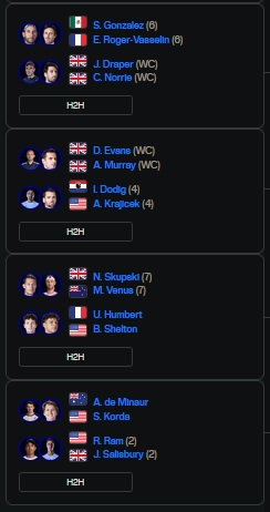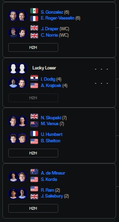The final quarter has Ram-Salisbury as the lead seeds. They finishes the clay swing with a flurry after struggling early, so they do arrive with some reasonable form. Their toughest match could be their opener against de Minaur-Norrie. We’ve already seen Korda’s danger on quick surfaces in doubles with the titles in Madrid alongside Jordan Thompson. And de Minaur made the semis with Norrie back in 2021, where they knocked off Ram-Salisbury in a super tie break finish along the way. An upset would not be a shock. The other match sees Venus-Skupski against Humbert-Shelton. Venus-Skupski were overwhelmed by the big serving duo of Bhambri-Olivetti in Stuttgart last week and Humbert-Shelton bring some of that same requisite big game to grass. I don’t feel safe picking against either of the singles pairs in this quarter honestly, they have that kind of ability on grass. Ram-Salisbury are obvious contenders IF they can avoid that early defeat, but it’s going to be tough.