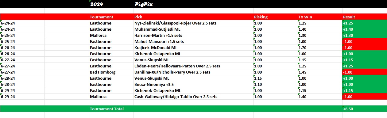 *The underdog win for Griekspoor-Stevens was the second largest of the tournament in 2023. Dogs accounted for six wins in round one and 15 total for the tournament. The largest dog score came in the round of 16 when Behar-Pavlasek stunned Mektic-Pavic as 6.79 (+579) dogs. The majority of the dog wins came in the first two rounds (11) with only four more in the following rounds. The number looks pretty steady with 16 dog wins in 2022 and 18 in 2021. The latter stages at Wimbledon haven’t been kind to the dogs with only five of the last 21 matches in the quarterfinals, semifinals and final seeing the favorites lose.