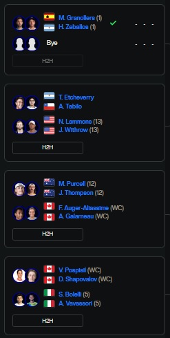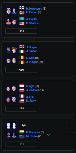When you dissect this quarter more closely, you tend to like Bopanna-Ebden’s chances more. It’s a lot like Ram-Salisbury to me, where they need that first win and then the roll could ensue. Heliovaara-Patten in theory have the better draw, so they should find themselves with a chance to play into a semifinal. If not one of those two, it might be one of the singles pairs with Bublik-Shelton seeming a bit more logical of a choice than the others.