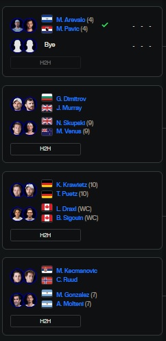 Both Gonzalez-Molteni and Krawietz-Puetz have no partner transitions to worry about this week and that might put one of them in position to secure the semfinal berth from this quarter. If it comes down to those two for a quarterfinal spot, Krawietz-Puetz own the only win in the head-to-head, a super tie break win in 2023 indoors. I’m intrigued by Skupski-Venus again as they showed tremendous chemistry when first teaming early in the Summer on grass. They’re dark horse contenders if they carry that form over. I need to see Arevalo-Pavic re-establish their dominance before I feel comfortable with them on hard courts, but I expect that will come, but it might be another week. Krawietz-Puetz could well be the silent assassins again in this quarter, quietly just winning match after match.