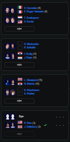 On paper, this screams Ram-Salisbury to win. Still with the unknown factor in the two one-off pairings for this week with Dodig-Rojer and Glasspool-Mektic, who knows. And then you throw in singles pairs with promise like Khachanov-Rublev and Griekspoor-Korda and thing look cloudier. Dodig-Rojer are the ones I really think could play into the mix here. They’re obviously experienced, but need to find each other’s games quickly.
