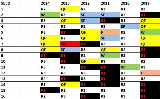 *The seed chart below shows the tracking for all seeded pairs over the last six years. You can see that Bopanna-Ebden’s championship as the two seeds broke a string of a top four seed not having won in a while. The last time was in 2017 when Kontinen-Peers won as the four seeds. 2024 also looks like an outlier as far as seeds going out early with only two pairs going one and done a year ago. Outside of the pandemic year 2020, at least four seeds had lost their openers each year since 2018. The other thing really sticking out is the lack of success for the #1 seed. 2013 was the last time the top seeds had been as far as the semifinals when the Bryans won the men’s titles. That was the end of their magical five year run, where they won the championship four times and made the final all five years.