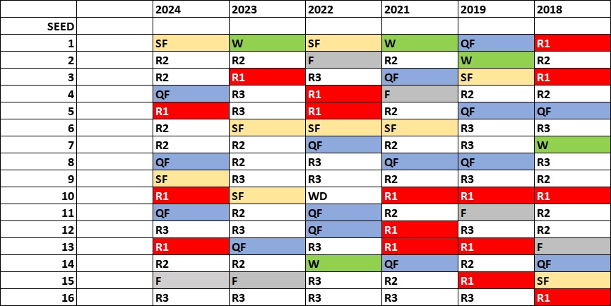 *As for the opening round and seeded upsets, the men’s draw has not produced a lot in round one. Last year’s three seeded upsets in the opening round was the largest number since four occurred back in 2018. The one thing that has been fairly consistent as you see in the chart below is that one of those early upsets usually involves a top five seed. Also take note of the fate of the #10 seed over the last six runs of Wimbledon.