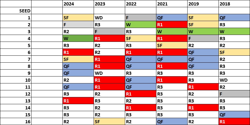 *Early upsets were few in 2024 with only two seeds being ousted in round one. That was a stark contrast to 2023 when the seeded field saw five pairs going one and done. For the most part as you’ll see below, you can expect a few early upsets. Also notice that a top six seed has gone out in each of the last four years with the #4 and #6 seeds being most vulnerable.
