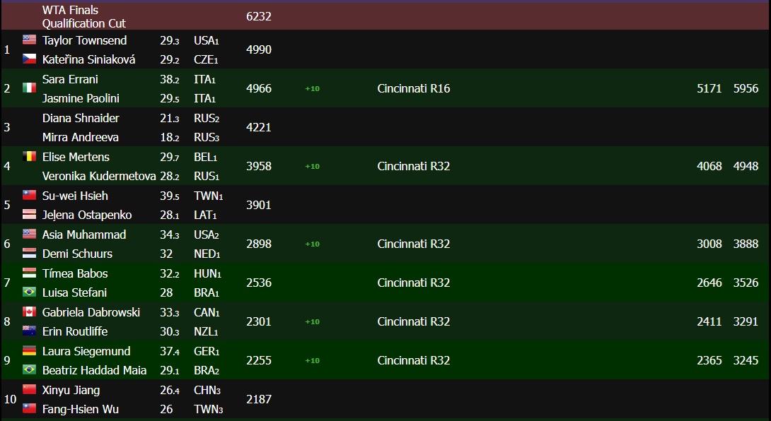 *Speaking of top four seeds, the last two years have seen the third seeded pair make the final. Outside of that, 2017 had been the last time that a top four seed made the final AND won when Chan-Hingis did the trick as two seeds. Being the top seeds in Cincinnati has not been a recipe for success. 2009 was the last time the top seeded pair MADE the final and it was also the last time the top seeded pair WON the final. That was courtesy of Cara Black and Liezel Huber. Only twice in the last nine runs of this tournament has the #1 seed made it as far as the semifinals. Will Errani-Paolini change that?