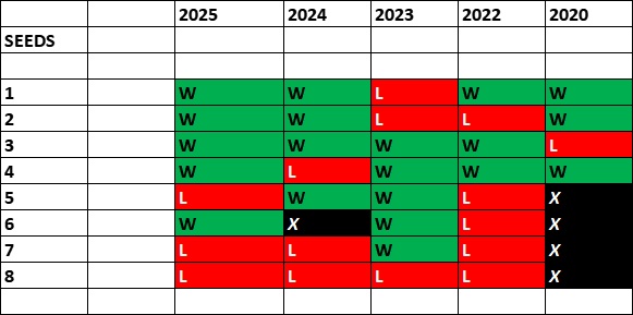 *If you’re looking for spots to focus your underdog search, it likely should start with the seeds coming off their first round byes. One of last year’s seeded upsets in round two produced the second biggest dog score at 2.83 (+183). In 2024, the three seeded opening losses all produced underdog winners of between 2.54 (+154) and 2.64 (+164). I’ll touch on these more in the ONE and DONE section.