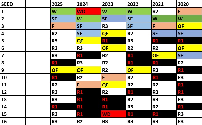 Seeds were fairly solid at avoiding trouble in round one a year ago with only three seeds losing their openers. That is about average for most recent years in Melbourne as you can see the seed chart below that shows the seeded results since 2020