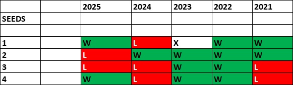 *Underdogs had a good showing last year with six wins in the 13 completed matches. Four of those u-dog wins came in the quarterfinals and semifinals between 2.02 (+102) and 2.51 (+151). Only three of the underdog wins involved a seeded pair losing. In 2024, there were five underdog wins in Stuttgart with two involving seeded losses. The big score came in round one when the top seeds, Krawczyk-Schuurs, lost with Schunk-Seidel winning as 5.44 (+444) dogs. 2023 had four underdog wins with a 3.03 (+203) hit in the opening round and 4.38 (+338) in the quarters.