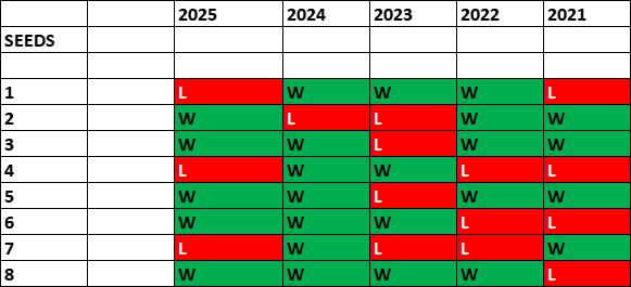 *The underdog win for Cirstea-Kalinskaya in the championship match last year was the cherry on top of the u-dog sundae as dogs accounted for ten wins in 2025. The big score came in the semis when Cirstea-Kalinskaya KO’ed (3)Hsieh-Ostapenko as 3.51 (+251) underdogs. That was their second win at 3.00 (+200) or more in the tournament. Half of the dog wins came in round one. The total was up one from 2024 (9) and two from 2023 (8). Check out round one again this year with the last three years seeing at least five underdog wins in the opening round.