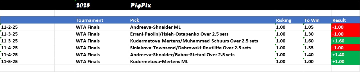 Here you’ll find a running record of the weekly tournament picks along with daily Pig Pix on selected matches.